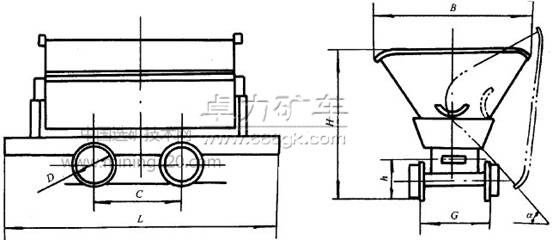 3.1 礦車型式為翻斗式,按車箱形狀分V型和U型。V型車一般以運(yùn)輸松散密度在1800kg/m3以下的物料為主,多用于地表作業(yè);U型車一般以運(yùn)輸松散密度在2500kg/m3以下的物料為主,多用于井下作業(yè)。
