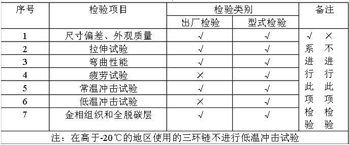 12.2.2 型式檢驗由國家授權(quán)的質(zhì)量監(jiān)督機構(gòu)負責(zé)進行,三環(huán)鏈經(jīng)檢驗合格,取 得產(chǎn)品合格證后方可銷售和使用。